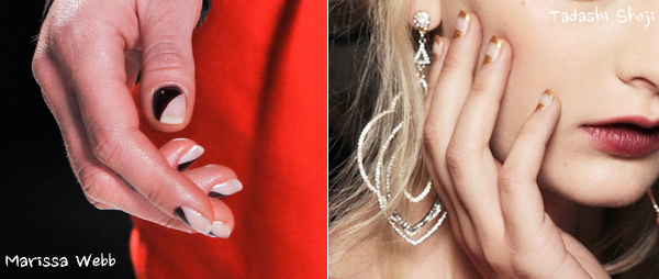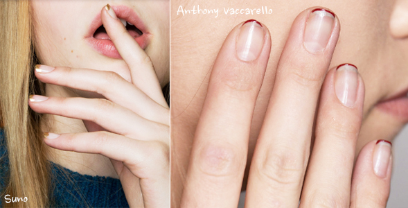"네가티브"는 오려진 테이프 등을 이용해, 이를 손톱에 붙여 매니큐어를 칠하는 네일아트 기법을 뜻한다. 특히 오려낸 테이프 모양대로 네일 아트를 연출할 수 있어, 손쉽게 따라할 수 있는 셀프 네일로도 각광 받고 있다. 하이-로우 스타일의 강자 마리사 웹 (Marissa Webb)은 올 가을 런웨이에서 대조적인 네가티브 스페이스 네일을 선보였다. 신진 디자이너로 주목받고 있는 타다시 쇼지(Tadashi Shoji)도 손톱 중앙을 칠하지 않은 네일을 연출했다. 수노(Suno) 역시 골드 색상의 네일을 선택했다. 이외에도 안쏘니 바카렐로 (Anthony Vaccarello) 등이 는 손톱 끝부분에만 얇게 그려낸 네가티브 네일을 선보였다. |