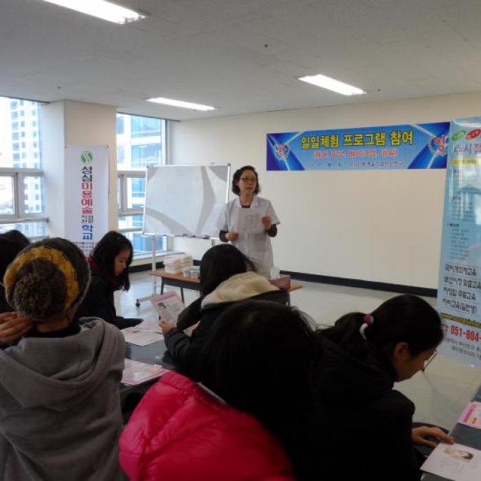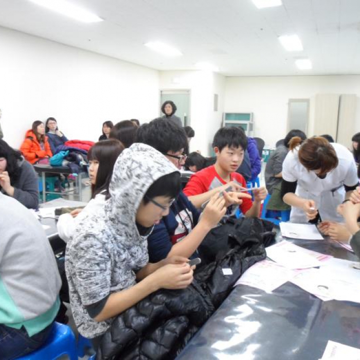 2012년 1월 17일 오후 3시 30분 ~ 4시 30분덕천여중 등 북구지역 중등 6개교(중학교 2학년 학생 76명)에서 피부미용체험(메이크업+분장)을 하기위해 방문하셨습니다.모두들 즐겁게 체험하는 모습이 보기 좋았습니다^^