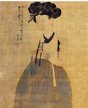 혜원 신윤복의 미인도. 18세기의 작품으로 조선 후기의 복식과 가발 문화를 엿볼 수 있다. 그림 속 주인공은 얹은 머리를 하고 있다. | |