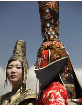 화려한 비단에 보석으로 장식된 몽골의 복타크. 원 지배기의 고려시대에는 두 나라 사이의 문화교류가 비교적 활발했는데, 몽골의 복타크가 족두리의 원형이라고 보는 견해도 있다. <출처: gettyimages> | |