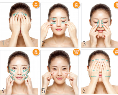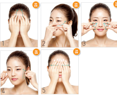 6. 양 손바닥으로 이마에서 관자놀이, 코에서 귀, 입에서 턱 끝까지 각 부분을 쓰다듬어준다.