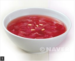 진달래 화채 오미자국물에 녹말가루를 묻혀 데친 진달래꽃을 띄운 음료로, 봄에 주로 만들어 먹었다. |