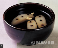 배숙 통후추를 박은 배를 꿀물이나 설탕물에 끓여 식힌 것으로, 궁중에서 즐긴 귀한 음료다. |