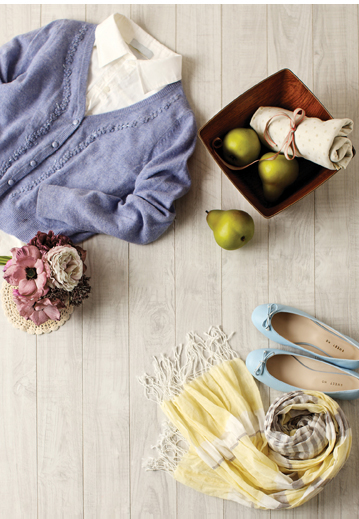 봄철 카디건은 가벼운 느낌을 위해 실의 굵기가 가는 것을 택하는 것이 좋다. 스카프는 환절기의 추위를 막아줌과 동시에 꽃가루와 황사에 대비하는 일석이조 아이템이다. | |
