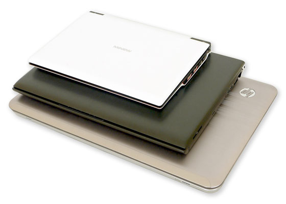 10인치 급 넷북(위)과 13인치 급 일반 노트북(가운데), 15인치 급 일반 노트북(아래)의 크기 비교