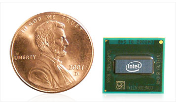 미국의 1센트 동전(약 19mm)과 아톰의 크기 비교. 넷북에 주로 쓰이는 인텔의 아톰(Atom) CPU는 크기가 작고 소비 젼력이 낮은 것이 특징이다. | |